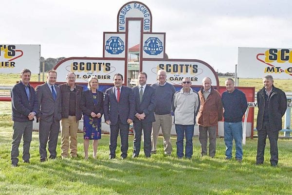 PAST THE FINISHING POST: Mount Gambier Racing Club committee members celebrate the funding windfall with Regional Development Minister Fiona Nash, Member for Barker Tony Pasin and Nick Redin from Thoroughbred Racing SA.
