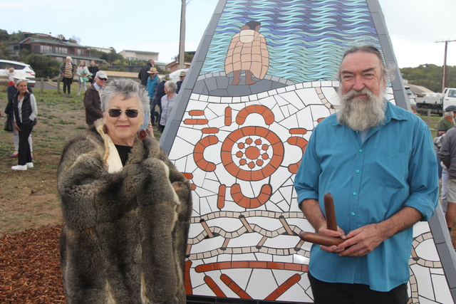 PIECED TOGETHER: Wearing her possum-skin cloak is Aunty Michelle Jacqueline-Furr who created the Indigenous design used on one side of the arch by artist Mike Tye. (Caroline Hammat: 470845)
