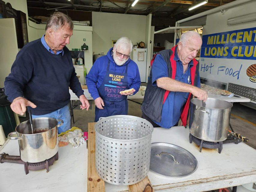 DINNER'S UP: Lions Club members Don Gilbertson, new president Stewie Pounsett and outgoing president Yogi McMillan cook up a feast for Millicent Shares a Plate. (Supplied)