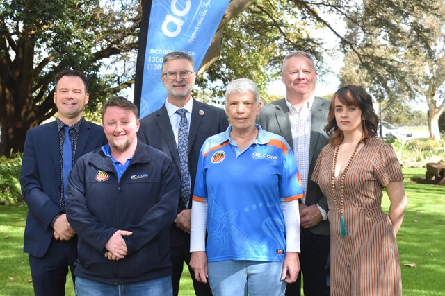 ac.care community engagement manager Jason Wallace, chief executive Shane Maddocks and emcee Barry Stafford (back) with ac.care client support officer Mark Collins, homelessness and community services manager Trish Sparks and advocate Danielle Malseed prior to the event. (Melanie Riley: 495944)