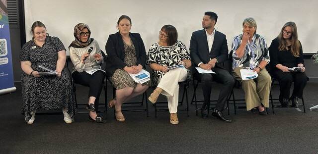 The 2025 Limestone Coast Local Health Network annual public meeting panel consisted of Hayley Tiglar, Dr Arwa Abdelmogod, Caitlyn Davey, Pauline Beach, Dr Hemant Diesh, Anne-Marie Steen and Sharon Grey. (Charlotte Varcoe 520528)