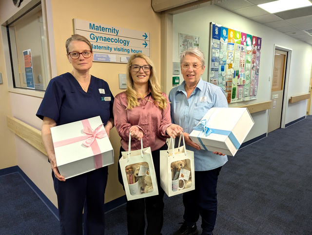 Associate Midwife Unit Manager Addie Guess, Rhianna Davy and Nurse/Midwife unit manager Sonia Wilson with the complete boxes and bags. (Melanie Riley: 521092)