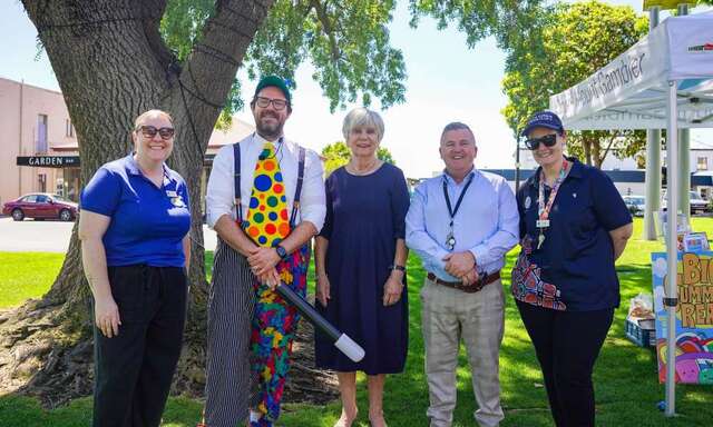 Children's and Youth Services team Leader Erin Jones, Whacky Mac, Mount Gambier/Berrin Mayor Lynette Martin, Mount Gambier/Berrin chief executive Paul Simpson and Mount Gambier Library Early Literacy Engagement Officer Bec Coates came to celebrate the launch of the Big Summer Read Program. (City of Mount Gambier)