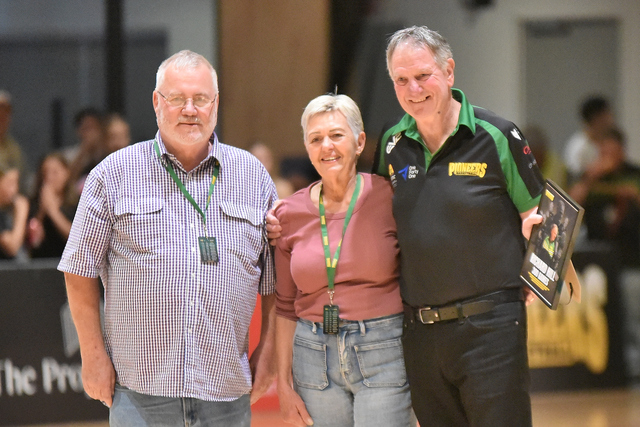 TRIPLE CENTURY: Former president and life member of the Pioneers Basketball Club Neil Boase, Dianne Hill and Pioneers men's head coach Richard Hill, pictured on Saturday night when recognising the latter's 300 game milestone. (James Murphy)