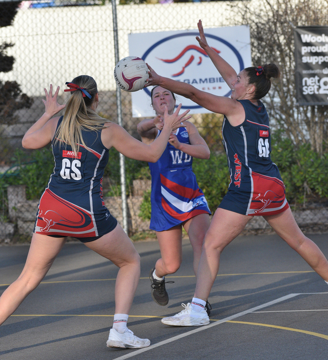 West Gambier's Sarah Ritter and Lisa McGregor make it hard for Casterton Sandford's Tessa Marra to move the ball out of the Roos' attacking third. (James Murphy: 482086)