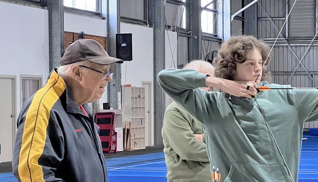 Visting Archery South Australia coach, Junior Alexander, observes Blue Lake Archers' Callum Oschar's technique during the coaching session organised by the club and Archery SA. (Submitted)