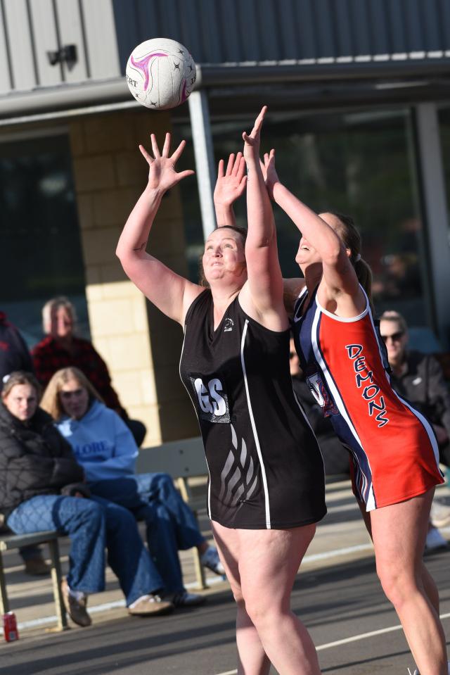 CONTEST: Ebony McDiarmid and Megan Hein fight for possession. (James Murphy 494763)