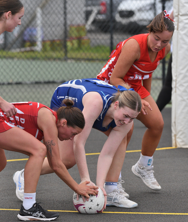Penola's Maddy Ha (centre) takes possession after a scramble with South's Mel Harvey and Ella Jolley. (James Murphy: 495493)