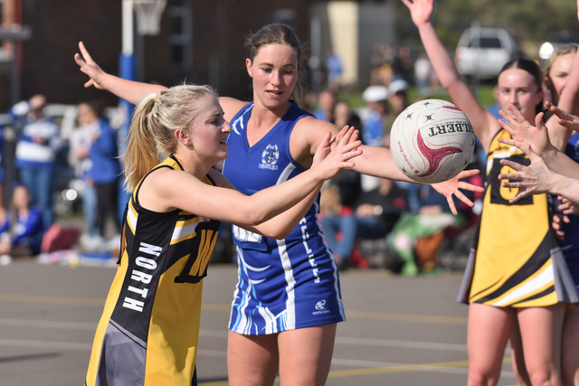 North Gambier's Jordyn Iovino makes a pass into attack during the B Grade preliminary final. (Elisabeth Champion: 503738))