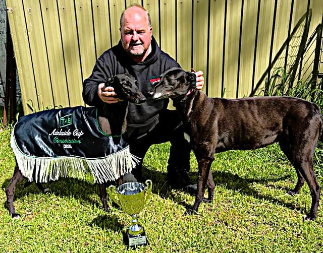 David Peckham with Bourne Model in her TAB Piping Shrike Adelaide Cup Consolation rug and her dam Sweet On Me, soon to whelp her fourth litter. (Supplied)